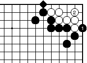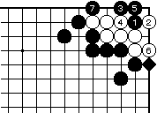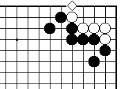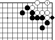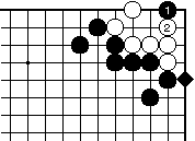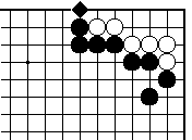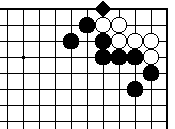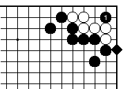 | 【隅の詰め碁縦角8目の「黒◆の下がりに白手抜き如何」の問題図】 | ||||||||||||