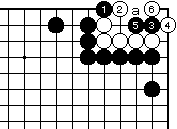 (黒の失敗図3) 前図の黒3でツケるのは白4から6で、黒はaに入れず白生き。 また、黒5で6は白5で生き。 |