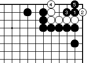 (白の失敗図2) 白が4と下がりを急ぐと黒5と曲がられ、この後白がどう打っても五目中手で白死。 |