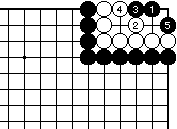 | (参考図1) 黒1、3に対し白4は突き当っている。これにより黒5を強要したため万年コウとなっている。 | |