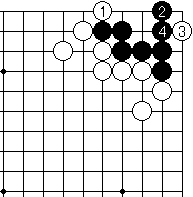 4/。5/ハイ。これに6と押さえると7/ハネ。ダメ詰まりで7の右には押えられないので死。 |
