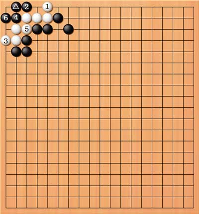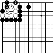 | 2/二の2頭ツケ。3/下がり。4/ツギ。5/ハネで隅の曲り四で内側の死。殺しにいく場合、ウッテガエシを防ぐツギを打たせて眼形を奪うことが多い。 |