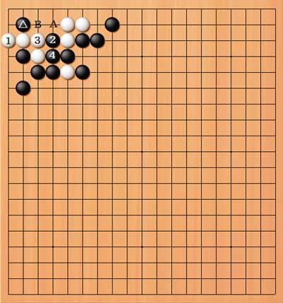 | このハサミツケが急所中の急所で白Aは黒Bまで。 | |