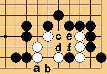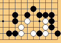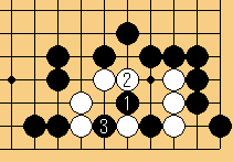 | すぐ眼につくところだが、これが一番白の待っている手で2/アタリ。この後どう打っても白は死なない。 |