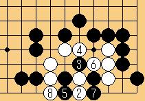 | 黒は白2子を取りにいくしかなく3/。4/。5/。6/。7/。8/と代わる。オイオトシにされる形になっている。 | |