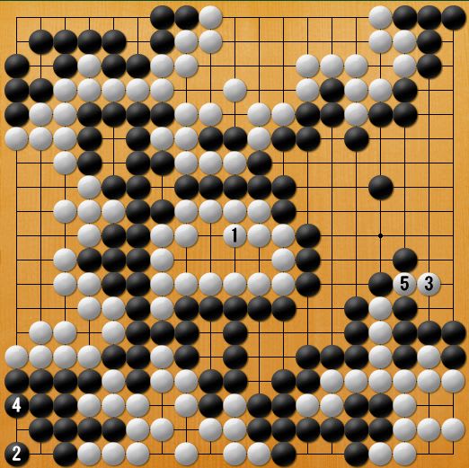 | 白は黒のコウ立てを受けざるを得ず白1の抜き。黒は黒2とコウを取り返す。白3はコウ立て。黒はこれを利かず黒4でコウのところを取り上げ黒生きに変じる。白5キリで振り代わり。セキがあると、こういう風にややこしいことになる。但し、実戦では、白から仕掛けず黒からは仕掛けられないので発生しない演習であろう。 |