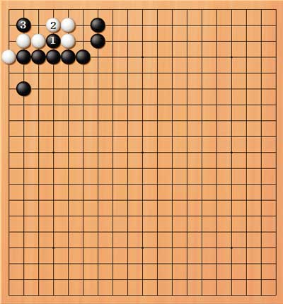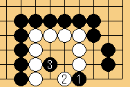| 3/中手狙い置き。2で3の所なら黒2。2で3の右なら黒3の上置きで生きがない。 | |