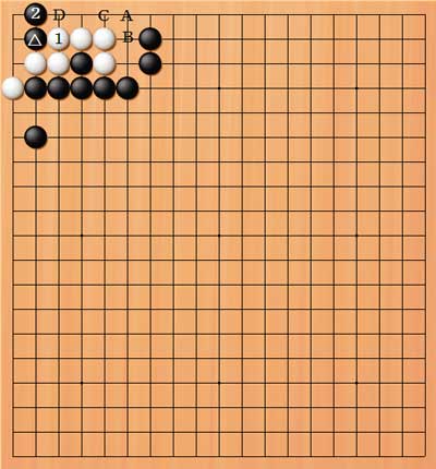 | 4/。5/。その後、白Aなら黒B、白C、黒Dということになる。黒2ではDでもよい。 |