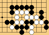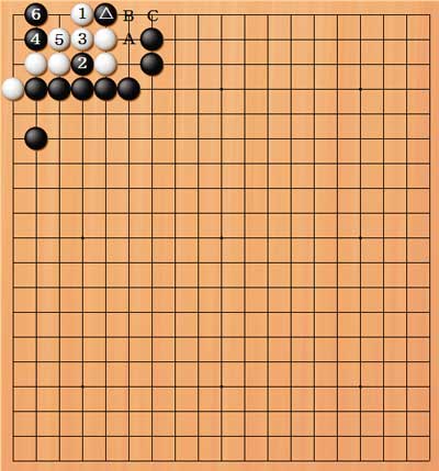 | これで内側(白)死となる。また、白A、黒B、白Cでも黒Bとウチ欠いて状況は変わらない。 | |