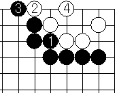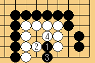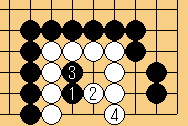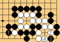 | 2/ハサミ。3/下がり。4/眼作り。この後、黒はどう打っても白2眼生きとなる。 | |