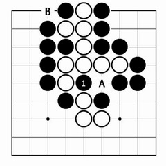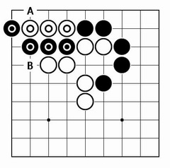 | 2/Aの黒の1子取り。3/抜き跡に黒1と打たれて、白石10個が取られてしまう。白Bと上の黒1子を取っても、黒Aで助からない。 |