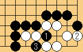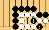 | 2/黒1子取り。この瞬間、白石はダメが詰まって3子がアタリの状態になっている。3/白3子取り。 |