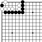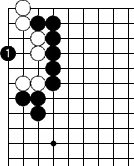 | 挟まれて三々に入ってできる形。1のダメが空いているうちは外側(黒)先でセキにしかならないがダメが詰まるとどうなるか? | |