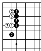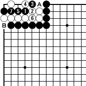 | 4/ノビ、5/押え。6/下がり。これで内側(白)は生きている。この失敗図より一の2の所が急所であることが分かる。 |