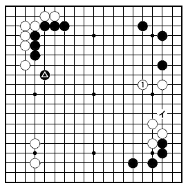 本図は上辺に△の開きがある碁形になっている。白イの飛びも部分的には立派な手だが、この形では守るだけでやや緩い。黒ロと上辺に開くのが大きな手になっている。右辺は手を抜く決断をして白1と上辺に開きたい。白地を増やして黒地を減らす絶好点である。黒2の打ち込みから14のブツカリまで、今度は黒が厚くなっても気にしません。上辺はすでに白が占めていますから黒模様が大きくなる可能性はない。 |