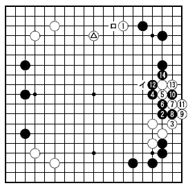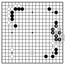 この手も大場であるが右辺手抜きがまずい。黒2の打ち込みから4とケイマするのが黒の狙い。白5のハイから7とはねて渡れば部分的にはどうということもないが、黒14のブツカリまで黒模様がめいっぱいに広がる。白13まで連絡しただけの白の姿がいかにもちっぽけに見える。白1と下辺に打った手が甘く黒の大胆な作戦を許したことになる。 |