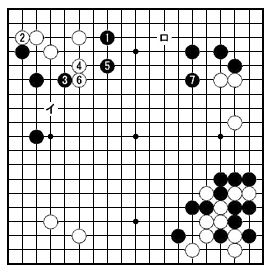 左辺の黒は三間開きでスキがある。黒イとケイマに守るのが定型だが、この碁では守るだけの緩い手になる。白ロの詰めに回られると上辺は白の勢力圏になる。そこで、黒1といっぱいに行くのが好点である。白2と隅を守れば、黒3の飛びから手順で黒5の飛びも利かす。黒7と右側も飛んで広げれば今度は上辺に黒の模様が出現する。