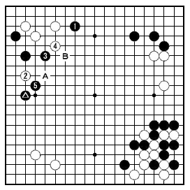 黒1に白2打ち込み。これは困らない。黒3と飛んで相手の出方を見る。白4と中に出てくれば、黒5のコスミで白2の動きを封じる。白4でAと逃げだせば、黒Bと飛んで好形である。▲の1子もまだ自由の身である。