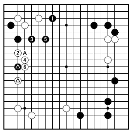 △の詰めが来たなら黒Aと守る一手である。手を抜いて黒1の詰めに先走ってもいいことはない。白2の打ち込みが強烈。黒3の飛びに白4とこすまれると▲を動くのは危険。黒5と飛べばこっちは好形だが白6で大きな白模様を作られる。後手でも受けておくべきか、手を抜いて他の好点に回るか、状況によって使い分ける必要がある。