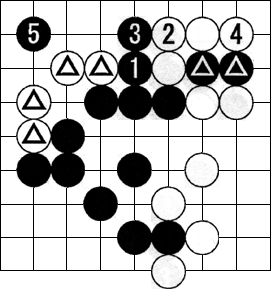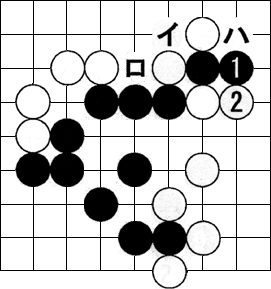 黒3(図の1)/。白4/。黒5/。白6/。黒7。黒3、5と打ち、▲の2子を上手に捨て白6まで▲を取らせたとき、黒7と打って△の4子を取る。上図の黒イからハでは黒の負け。本図なら捨て石の筋を使っての見事な勝利となる。この発想ができるかどうかが問われている。