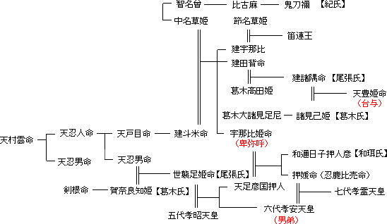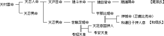 尾張氏系図には、天忍男(あめのおしお)という人物が親子二世代にわたって登場する。建田背の妹宇那比姫が天足彦国押人(あまたらしひこくにおしひと)と同世代であることを理由に、世襲足媛の父親は二世代目の天忍男として作図している。それでなければ和邇氏系譜と尾張氏系譜の間で整合性がとれないからである。 記紀伝承によると、九代開化の皇子、彦坐(ひこいます)は、母親の妹、袁祁都比売(姥津媛・おけつひめ)を妃にしたとする。すなわち叔母を妃にしたという。ちょっと信じ難い伝承である。ところが和邇氏系譜によれば彦坐の妃は、彦国姥津(ひこくにおけつ)の子、意祁都依比売(おけつよりひめ)で、彦坐と同世代の女性である。こちらの方がよほど信じられる。この事からも、和邇氏系譜は偽作ではない。