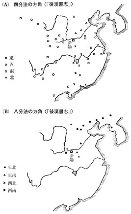 東西南北の大方向(四分法)と、(B) 東北・東南といった小方向(八分法)とに分けて図示してみます(下図)。