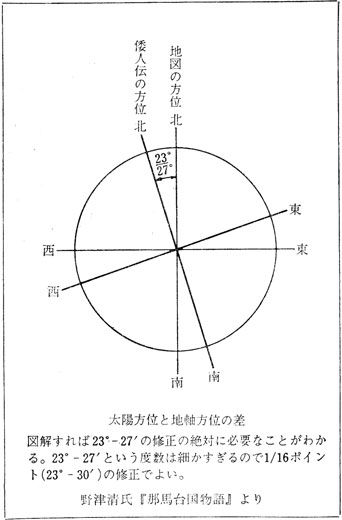 事実がハッキリした今、わたしはいっさいの未練を捨て、新しい問題にとりくもうと思います。それは、わたしとあなたとの「差異点」についての検証です。あなたがわたしの根本の解読の論理を「無断借用」しながら、別の地点(宇佐)に行き着かれた、その理由を今は吟味する時なのです。第一に例の「黄道修正説」。“古代中国人にとっての「方角」とは、春分・秋分の日に太陽の出てくるときを真東と考えたものだ。これは現代の磁石で計る真東から二三度二七分(約二三度三〇分)だけ北にずれている。”この説が「科学に立脚」する「万人の認め得る修止」と称され、全篇各所にくりかえし強調されています。これこそ「神津先生の創意」と呼びたいところですが、実はこれにも先行者があります。野津清氏の『邪馬台国物語』(雄山閣刊、昭和四十五年)がそれです。くだくだしい説明より次の図(同書三九ぺージ)を見れば一目瞭然です。けれども、あなたがこの本を見ていた、という証明がありませんから、今は一応「偶然の一致」としておきましょう。(注)