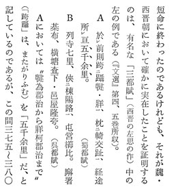 (30) 「三都賦」(蜀・呉・魏の三都の賦)の冒頭には作者(左思)の作賦の方針が書かれている。「賦二三都一、其山川城邑則稽二之地図一、鳥獣草木則験二之方志一。・・・何則発レ言為レ詩者、詠二其所レ志也、升レ高能賦者、頌二其所レ見也。美レ物者貴レ依二其本一、讃レ事者且*レ本二其実一。匪レ本匪レ実、覧者奚信。」(三都賦序)左思はこの三都賦を作るとき、「地図」と「方志」(地方誌)をもとにして検証した、といっている。その理由は、「詩」の場合は“表すところ”すなわち作者の主観性の表現であるのに対し、「賦」の場合は、“見る所”すなわち客観性の反映でなければならぬからだ、というのである。そしてそういう現地の基本的事実に依拠しなければ、もの現地を覧(み)ている読者(現地の人や現地に行った人)がどうして信じるだろう、と反問している。左思は蜀呉平定後の西晋の都洛陽においてこの「三都賦」を書いた。このとき洛陽の読者は、蜀・呉討伐の戦いに実地に参加した人々(将吏・兵士)であったから、この論旨は切実性をもっている。(さらに蜀呉の知識人にも読まれるであろう。)こうしてみると、この「三都賦」中の「五千余里」や「七里」は、実地の地図上の事実を背景に書かれたもの、と見なすほかない。