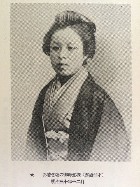 御母堂様は、お孫さんにあたられ、教祖はいつも『たまさん』とお呼びになり、私は曽孫(ひまご)にあたりますが『おもと』とお呼びになりました。御母堂様のことを、私は「お姉さま、お姉さま」とお呼びしては、二人して教祖の所へ、日に何度も遠慮なしに伺うのでお食事中のこともありました。そんなとき教祖は、『ちょっと待ちや』