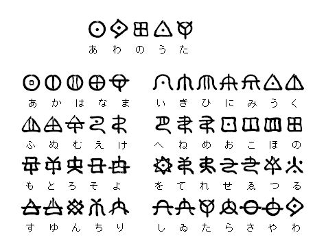 | 二神(ふたかみ)の おき局(つぼ)に居て 国生めど 民(たみ)の言葉の 悉(ふつ)曇(くも)り これ直さんと 考えて 五音(いね)七道(ななみち)の アワ歌を 上(かみ)二十四(ふそよ)声 いざなぎと 下(しも)二十四(ふそよ)声 いざなみと 歌い連ねて