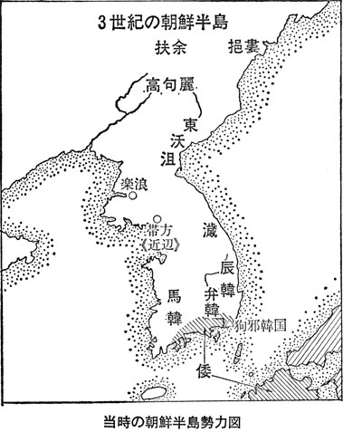 韓伝を見ますと、この辰韓の王様のことは書かれている、辰韓の王様は辰王でございます。これもいろいろな問題があるのですが、いまは省略します。そして、弁韓にも十二の国にまた王がいるというふうに書かれています。これも何という王か名前は書いてありませんが、やはり王がいると書いてある。 ところが不思議なことに、馬韓については王がない。王が書かれていないわけです。これは一体なぜだろうと。よく読むとその理由ははっきり書いてあります。と言いますのは、本来ここに当然、馬韓の王はいたわけです。ところが楽浪・帯方郡、つまり当時の中国側が、辰韓の一部どの辺からとは書いてありませんが、これを割譲してしまった。つまり辰韓の方から取り上げて、自分に直属させてしまった。その理由は、元々、辰韓は楽浪郡に属していたからである、こういう理由で取り上げた。 さてこの韓伝には、馬韓が辰韓を統轄していたように書いてある。そこで韓王(馬韓の王)は非常に怒って、これに対して軍をもって楽浪・帯方を攻撃した。帯方郡の太守はそのために戦死した。ですから、当時は馬韓が韓国代表で、韓王の軍が非常に優勢だったわけです。ところが、恐らく中国本国から援軍が来たのでしょう。形勢が逆転しまして、ついに韓王は敗退した。そして、ついに「中国側は韓を滅した」こう書かれております。