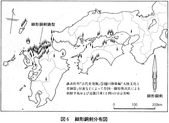さて、ここで今の話を整理いたします。つまり、剣というのは諸公や諸王や将軍、せいぜい大夫 ーー難升米が大夫だったと倭人伝に書いてありますが、そういう連中が護身用として、またシンボルとして持っていたのが剣なのです。それに対して軍勢が、もちろん全員ではありませんが、軍勢の統率者みたいな連中が持っているのが矛であり、戈である。そうしますと、いま博多湾岸に矛や戈の鋳型が集中している。矛は一〇〇パーセント近く、戈は両翼に広がりながら、やはり博多湾岸を中心に鋳型が存在している。それの実物の分布図は、北は朝鮮半島の洛東江沿いに、かなり広く分布している。「倭人」の関係でしょうね。「倭の土地」があった証拠でしょう。そして、南は四国の西半分ぐらいのところにまで分布している。これは、いいとしましょう。
