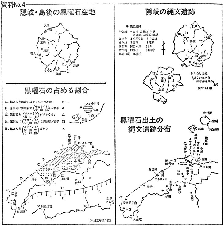 では、なぜ縄文時代にそれだけスケールの大きな信仰圏が成立できたか。わたしにはこの答は、一つしかない。明白であるように思われました。その答は黒曜石でございます。これは非常に硬くて黒くて美しくて、そして非常に割れやすい。その特徴を持つことによって、縄文時代においてはダイヤモンド、金・銅・鉄を合わせたような貴重な材質として珍重されたものが黒曜石であることは、皆様もご存じと思います。 日本列島で質がよく、量の多い場所はそれほどございません。北海道の十勝地方、信州の和田峠、出雲の隠岐島、そして九州の国東半島の先にある姫島。ただし、ここは白曜石と言った方がいいでしょうね。それと佐賀県の腰岳、これだけなのです。特に、本州の中では信州の諏訪盆地と松本盆地の問にある和田峠と出雲の隠岐島が二大産地である。 わたしは、去年出雲の隠岐島にまいりました。皆様よくご存じでしょうが、現在でも黒曜石はおびただしくございました。ある海岸では歩きましたところ、拾えども拾えども、ポケットがすぐ一杯になって・・・もっと大きな黒曜石があって、今まで拾ったものを全部捨てて大きいのを拾っていくと、またさらに大きいものがあって、またポケットから全部捨てて拾い直すという、少年時代にやったようなことを経験しました。しかもそれは非常に純黒の良質の黒曜石でございます。 縄文時代に隠岐島では黒曜石を取って取って取り尽くした。今は残骸の島であるはずなのですが、その残骸の島がまだあれほど豊富な良質の黒曜石を蔵している。それほど隠岐島の埋蔵量は大変なものです。その黒曜石をバックにして出雲における黒曜石製品の分布、すなわち縄文文明の証拠を示すものが、資料のNo.4にあります。これは宍道正年さんがお作りになった貴重な地図でございます。A・B・C