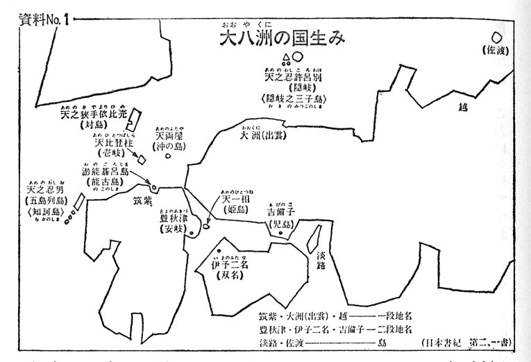 さて、それでは最初のテーマに入らせていただきます。昨年の七月から八月にかけまして、斐川(ひかわ)町から三百五十八本の「銅剣」が出てまいりました。みんな驚きました。学者あたりが真っ先に驚いたようですが、実はわたしはあまり驚きませんでした。大変驚かなかった。変な言い方ですが、「そうだろう、そうだろう。やっばり出ましたか」というのが、わたし自身の正直な反応でございました。なぜかということは、今から申し上げます。 さて、その時わたしは・・・今でこそ皆さん百もご承知の三百五十八という数を覚えるのにちょっと苦労しまして、そこで昔、皆さんも中学・高校の勉強のときにおやりになったと思うのですが、三百五十八を「ミコーハ」と「ミコハ断(た)つ造作説」と、こういう言葉にして覚えたわけでございます。断つというのは、もちろん剣か何か(実は矛か戈 ーー後述)だから「断つ」なのですが、「造作」説とは何だというのは、本日の中心をなすお話で、やがておわかりいただけるところでございます。 「造作」説というのは、津田左右吉さんという方が大正から昭和にかけて発表された説であって、「『古事記』、『日本書紀』の神話・説話は嘘である。歴史事実とは関係のない全くの作り話である」ということなのですが、よくもあの時代にあのような説を発表されたと思うのです。大変な勇気だと思います。早稲田大学で、そういう講義をされたわけです。ところが、当時の東大、京大、その他の大学の学者は皆、皇国史観ですから、一切それを相手にしなかった。ところが戦後一転して、この津田左右吉の考えが定説になった。それで学会も教科書も全部、津田左右吉の考えに従って作られてきたわけです。そして神話などは一斉に教科書から追放されてしまったわけです。 わたしが古代史の世界に入りましたのは、遅かったのです。昭和三十年代は親鸞の研究に没頭しておりました。いわゆる「中世」です。そして、昭和四十年前後の頃に古代史の世界に入ってきたわけです。わたしは、「おかしいぞ。神話造作説は問違っているのではないか。神話はそんな作りものではないらしいぞ」、こういう感じを持ったのです。と言いますのは、今から思うと、古代史に入ってきた時期がよかったのです。 なぜなら、昭和三十年前後の頃、文化財保護法ができまして、それまではいいものはすぐ骨董屋へ運ばれていたものが、いきなり国の財産ということで公共の管理の場に出てくるようになった。それで考古学的な出土物の分布図がわれわれの目に入ってきたわけです。 そうしますと、まずわたしが気がつきましたのは「国生み神話」というものでございます。これは年配の方は子供のころ習ってどなたもご存じかと思いますが、伊邪那岐(いざなぎ)命・伊邪那美(いざなみ)命の男女の両神ですね。淤能碁呂(おのごろ)島というところで、海の中に天の瓊矛(ぬぼこ)というものを差し入れて、それを引き上げるとポタポタ(「コホロ・コホロ」と書かれています)と海の滴が垂れて、それが大八州の国になったという話です。瓊矛という瓊(ぬ)は玉ですから、勾玉などを紐で括(くく)りつけた矛という意味でございます。『日本書紀』一書ではここのところが、天の瓊戈(ぬか)となっています。やはり、あとは同じで天の瓊戈を差し入れて引き上げたらコホロ・コホロという形でこうなっているわけです。ですから、五つぐらいの説話は矛(ほこ)であって、一つだけは戈(か)という形で使われている。これは『古事記』、『日本書紀』を見れば冒頭に出てまいります。