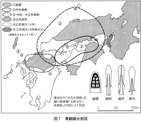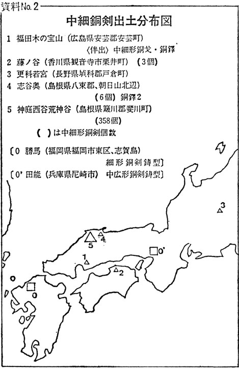 問題はその東側に中細剣・中広剣という世界があると、考古学者は言うわけです。それが、いま皆さんがお持ちの地図に出ていると思いますが、その地図のNo.5に出ておりますように、出雲から土佐までを含みまして大きなおむすびのような形に囲まれているのが中細剣・中広剣の領域なわけです。それに対してその次の平剣という、さらに幅の広い大きなものになったものが、瀬戸内海周辺の領域に狭(せば)まった。なぜ狭まったかが、また非常に面白い問題になる。ところで、この図では中細剣・中広剣というのは数が少なかった。ところが三百五十八本出てきた。実際に存在したのはその五倍、十倍、あるいはそれ以上である。これは先に申したとおりです。