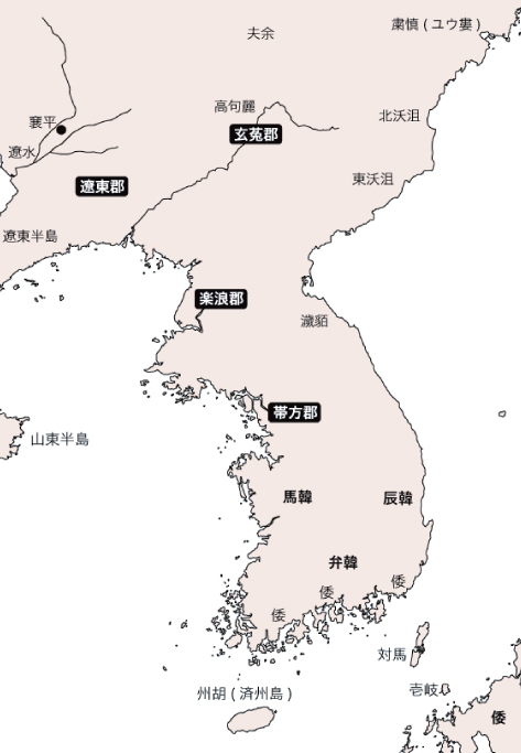 | 前述のように中国の歴代王朝との交易はかなり早くから行われていたらしいことが推測されるが、その記述のされ方からすれば、いわば国家形成以前の成熟過程としては「倭.または倭人」として存在が認められていたようである。いわば各々が独立した自然村落的社会集団を形成している段階の国邑像を思い浮かべれば良いと思われる。 既に、この国邑のうち有力なそれは、かっては楽浪郡、この頃においては帯方郡を折衝の窓口としながら、中国歴代王朝及び周辺諸国との関係を深めていたことが推測される。特に前漢時代の元封2〜3年(前109〜前108年)にかけて武帝(前141〜前87年)により衛氏朝鮮が討伐された結果、朝鮮半島に「楽浪郡、真番、玄菟、臨屯」の四郡が置かれて以降において、「ここにおいて東夷初めて上京に通ず」との記録が為されており、武帝の朝鮮出兵による朝鮮半島の支配が東夷との交易朝貢関係を大きく進展させることとなったようである。大陸との交流は非常な速度で倭国の政治的経済的文化的な発展を促すことになり、この時代を経過して「倭人」は「倭国」として認識される段階に変貌を遂げていった様子が推測される。 |