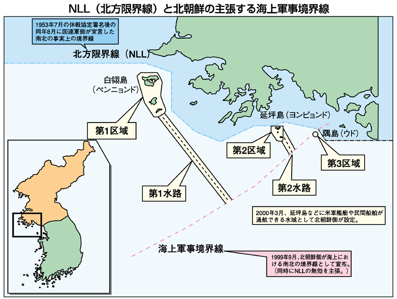 「毎日新聞 2010年11月26日 東京朝刊 質問なるほドリ:黄海の「NLL」って何?=回答・工藤哲」◇国連軍が主張する境界線 北朝鮮は反発、独自に設定なるほドリ 北朝鮮砲撃事件が起きた周辺海域について「NLL」っていう言葉を耳にするけど、どういう意味? 記者 英語の「北方限界線」(ノーザン・リミット・ライン Northern Limit Line)の頭文字で、米国や韓国側が根拠とする、黄海上に引かれた北朝鮮との事実上の境界線と言っていいでしょう。 Q 何かややこしそうな感じだね。 A NLLをより正確に言うと、朝鮮戦争(1950~53年)の休戦に伴い、韓国に駐留する国連軍が「見張りのため自由に航行できる北限の線」として、独自に設定したものです。 Q 北朝鮮はそれを認めているの? A 「一方的なもので無効だ」と主張し、NLLの南方に、北朝鮮独自に別の境界線を設定(99年9月)しました。この海域は二つの境界線が存在する不安定な状態に置かれているのです。 Q 二つの境界線を挟んだ海域では、何度も軍事衝突が繰り返されてきたようだね。 A 韓国と北朝鮮は99年6月、02年6月、09年11月に二つの境界線の内側で交戦しました。今年3月にも韓国の哨戒艦が北朝鮮によるとみられる攻撃で沈没し、兵士46人が犠牲になりました。今回北朝鮮から砲撃された延坪島はNLLのすぐ南部にあります。北朝鮮が独自の境界線を主張するのは、その海域がワタリガニの豊かな漁場で、ワタリガニ漁が貴重な外貨収入源になっているためとの見方もあります。 Q この海域で軍事的緊張が高まると、周辺国にも影響があるの? A 中国は黄海をいわば「庭」と位置付けています。今回の砲撃事件を受け、米国と韓国はこの海域で28日から米原子力空母ジョージ・ワシントンなどを参加させて軍事演習を実施します。そうなれば中国も無関心ではいられません。9月にも黄海で米国と韓国が軍事演習をしましたが、中国が反発したため、空母の参加は見送られました。つまり黄海を挟んで北朝鮮・中国、米国・韓国が兵器を向け合っている構図になっているのです。NLL周辺海域は「海の火薬庫」とも呼ばれています。(外信部) |