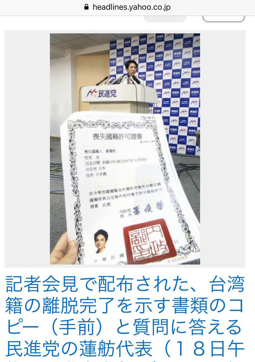 | 2017.7.18日、二重国籍問題を抱える蓮舫代表が民進党本部で戸籍謄本の一部と中華民国(台湾)政府が証明する「国籍喪失許可証書」のコピーを公開した。台湾国籍を抜き日本国籍を取得していることを証明するためである。蓮舫氏は17歳の時に父親が自分の台湾国籍を抜いてくれたものと思い違いをしていたという。実際は2016年9月13日に台湾国籍を正式に喪失し、同年10月7日、国籍選択の宣言をした。(国籍取得は1985年1月21日。蓮舫氏17歳である)。「戸籍の公開は私で最後にしてほしい」。 |